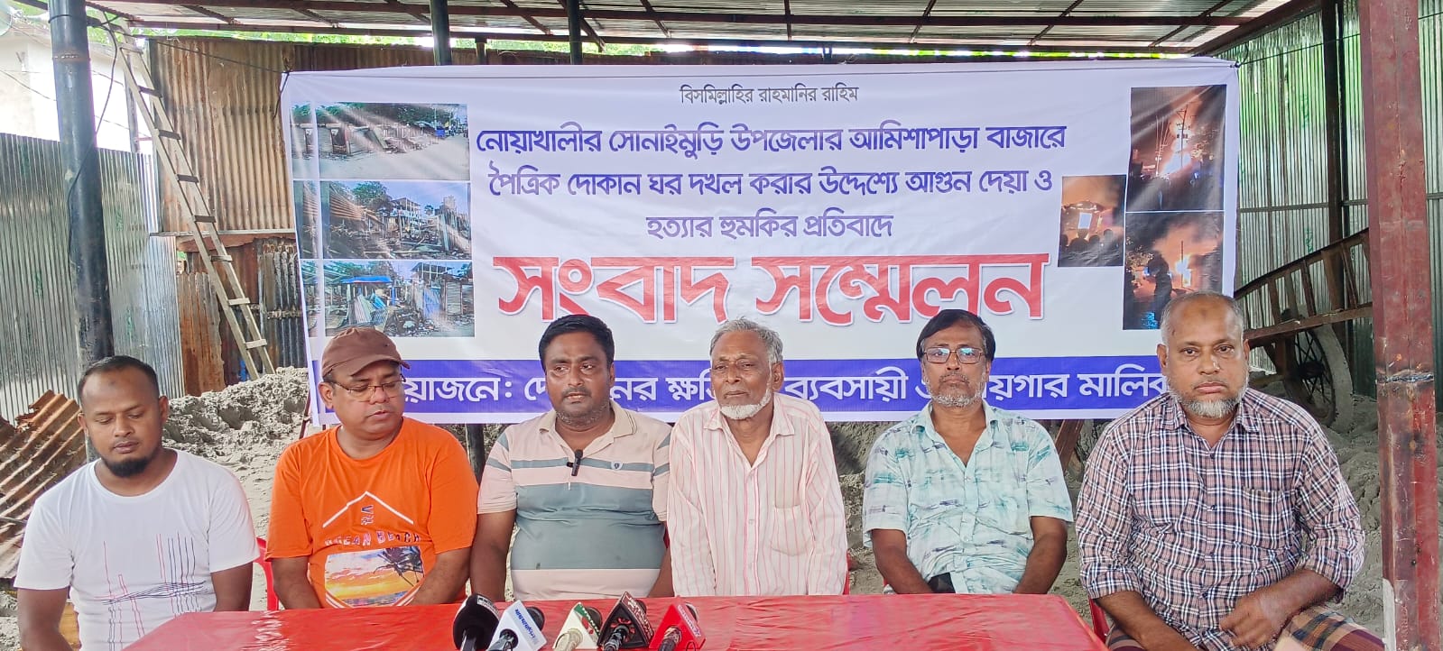 নোয়াখালী প্রতিনিধি নোয়াখালীর সোনাইমুড়ী উপজেলার আমিশাপাড়া বাজারে দোকানঘরে অগ্নিসংযোগ করে দখলের চেষ্টা ও হত্যার হুমকির প্রতিবাদে সংবাদ সম্মেলন করেছে দোকান